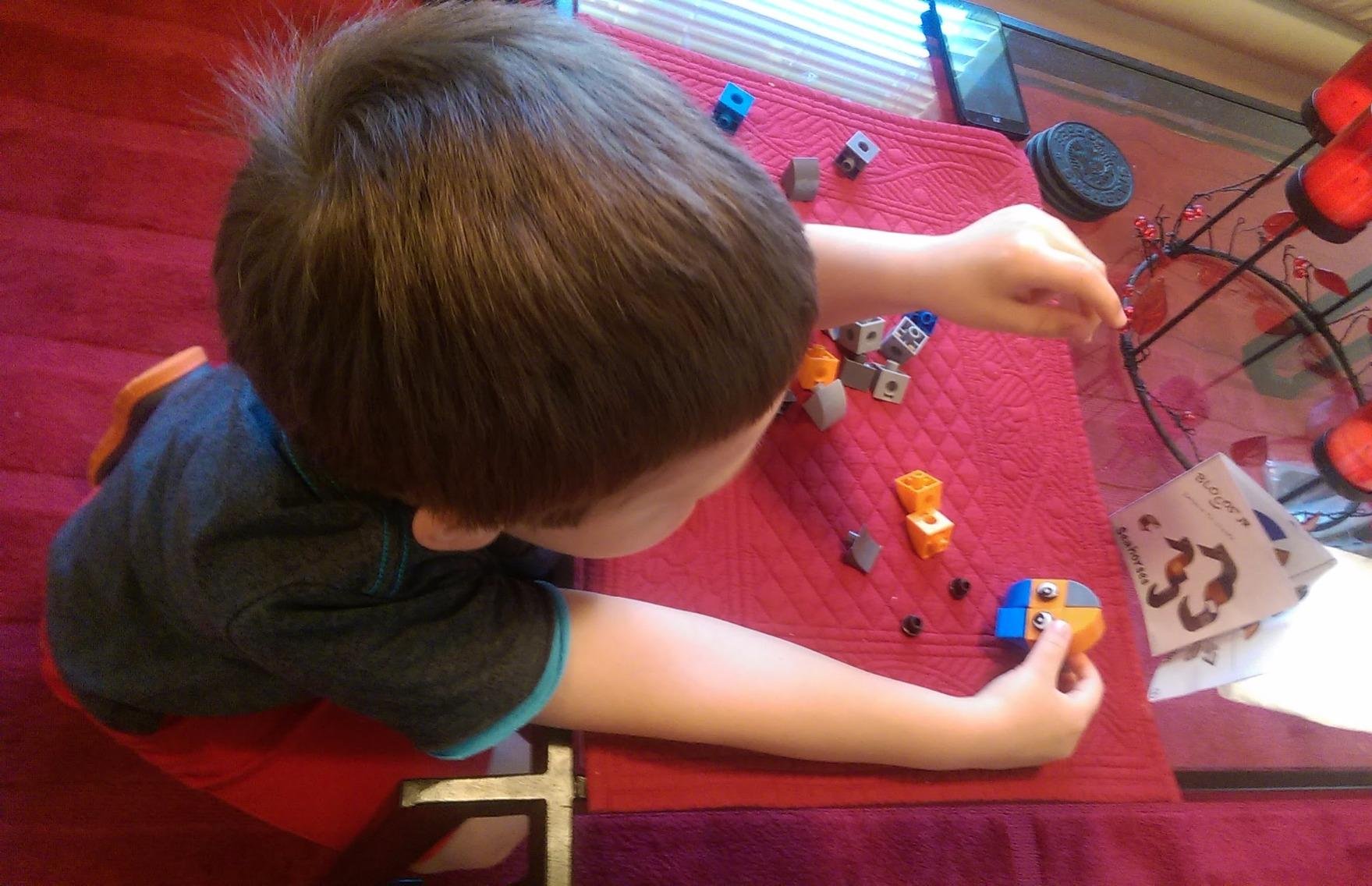He told me he needed help to make the things in the pictures but I really wanted to empty the dishwasher before taking him to the park. I told him that they're just like Legos (which like most kids his age I think are, he's very familiar with) and he didn't have to make what's pictured, he could build anything he wants. He immediately got to playing and building.