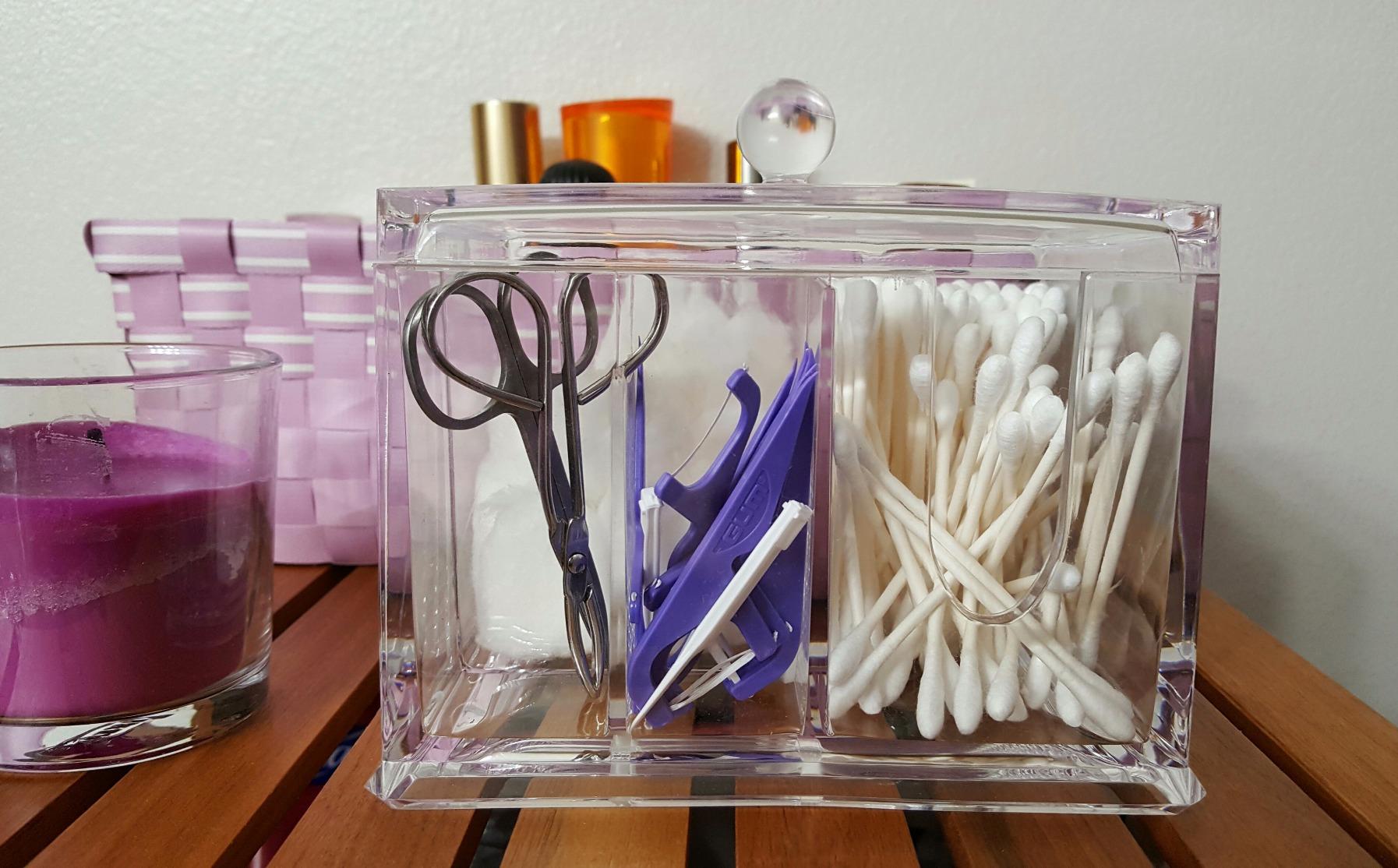We're using the two smaller sections for dental picks and tweezers and scissors and the back section for cotton balls. The uses for this type of container are endless, as the product pictures depict.