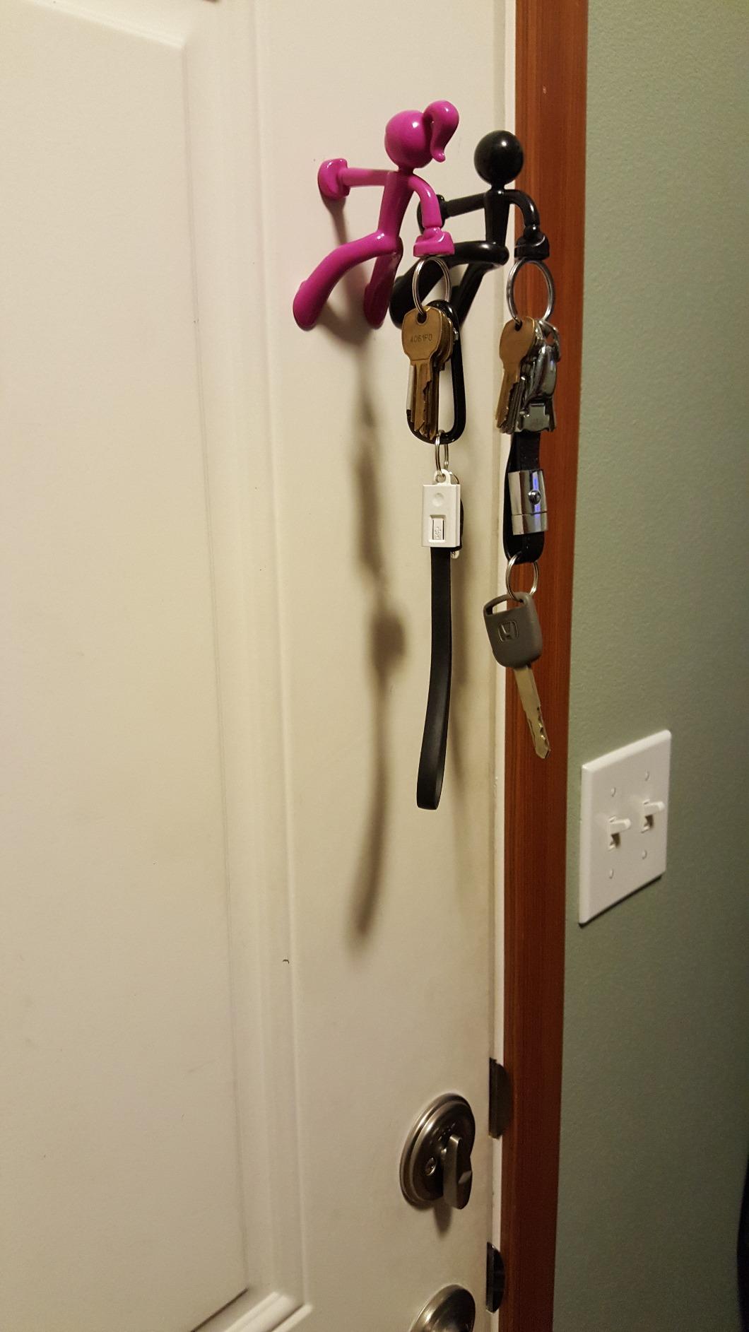 I was shocked to find that the keys don't drop, even when we swing the door open and shut. Love that the key girl looks like she's climbing our front door.