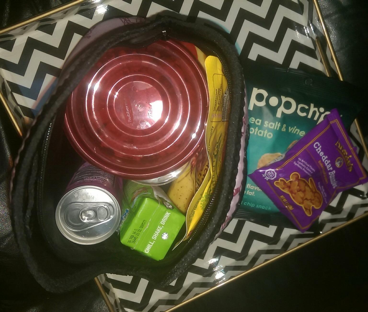 There's a banana under the bag of Tasty Bite lentils, a Rubbermaid container that holds 3 cups of soup, an 8 oz sparkling juice, a protein shake, bag of bunny graham crackers, and a bag of chips. Would I actually eat all of this in one sitting, lol, probably not but you get the idea!